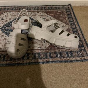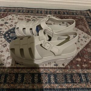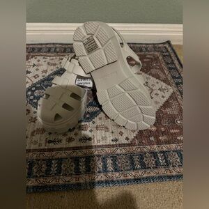 Stylish Skechers sandals. Cream color. Comfortable design.