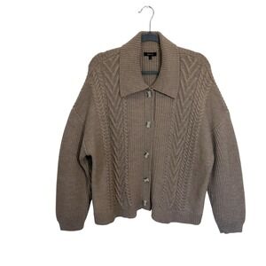 Merino wool cardigan features a sophisticated cable knit design with a classic polo collar and button-front closure. The heavy-knit texture provides warmth and structure, while the dropped shoulders create a relaxed, contemporary silhouette. Marbled buttons add a touch of detail to this versatile earth-toned layering piece.