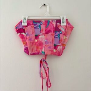 pink corset, strapless top, tie back, shein, new without tags, feminine, fitted, glossy finish, elegant, summer top