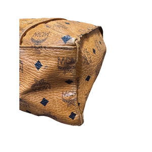 The MCM Visetos Tote is a large square-shaped bag with a zip closure and double shoulder straps in cognac leather. It features a monogram pattern with gold hardware, vintage design, and a coated finish. This stylish tote is perfect for travel, casual, workwear, and business occasions, making it a versatile and fashionable accessory for women. Made in Germany, this bag exudes luxury and sophistication with its high-quality materials and classic design from the MCM brand. 15.2”x10”x5” 18” strap drop approximately. This vintage beauty has faded hardware showing the brass metal and very minimal corner rubbing. It’s hard to see. That’s it! Clean interior. It can carry laptops, iPads and more. Has one interior pocket. Diagonal measurement is 18”.