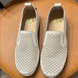 Beautiful laser cut leather slip on made in Spain. Man made sole , removable gel cushion is like walking on a cloud. NWT European size 40