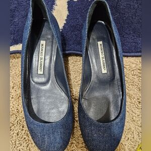 Chic denim blue flats by Manolo Blahnik. Perfect blend of style and comfort. Round toe.
