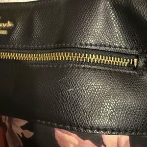 Elegant tote with a striking rose pattern. Features a front zipper pocket. Ideal for daily use. A lot of life left in her. She has two small scratches pictured as well as the edges of the handles also pictured! Make an offer. Price is reflective of the issues.