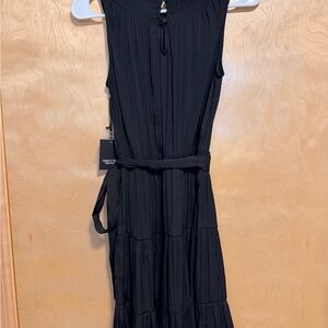 Chic black midi dress with a sleeveless design. Features a stylish belt for a flattering fit. Perfect for versatile occasions.