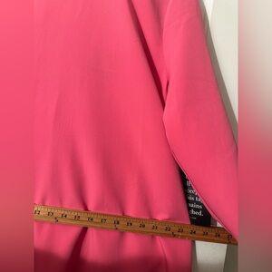 Bold and polished hot pink shift dress featuring a feminine ruffle neckline and dramatic bow back detail.