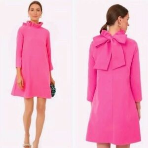 Tuckernuck Hot Pink Daphne Dress, a vibrant mini dress featuring a ruffled stand collar, three-quarter sleeves, and a large decorative bow on the back.