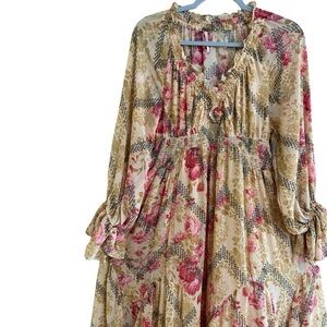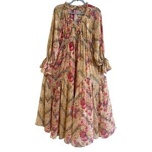 Beautiful Free People floral maxi dress featuring a smocked waist, ruffle trim neckline, and flowy long sleeves with tie cuff detail. Lightweight fabric with soft lining hidden side pockets, and romantic boho silhouette.