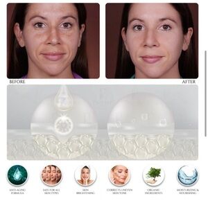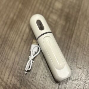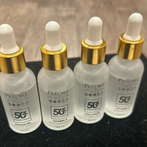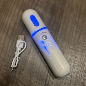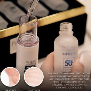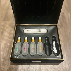 Complete skincare set featuring a device and five serums. Includes USB charging cable. Perfect for a comprehensive skincare routine.