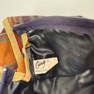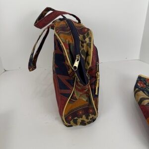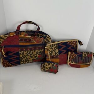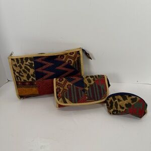 Large 13" x 10" X 3' deep, zipper lined toiletries bag with handles. , extra side zipper.. gently used , has small spot on bottom. Gently used 10" x 7 " lined Zipper top cosmetic bag. Unused 7" X 5" zipper, lined cosmetic bag with attached mirror. Unused 4 1/2" x 3" Lipstick with key fob zippered lined case. Dark colored modern print. Non smoking home