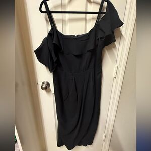 Tags: formal, cocktail, lbd, black dress, date night, cold shoulder, faux wrap, ruffle, midi, short sleeve