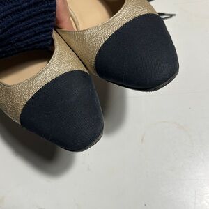 Chic CHANEL slingback heels in gold and black. Elevate your style effortlessly.
