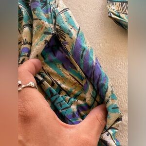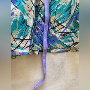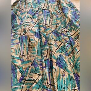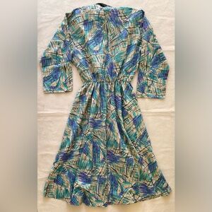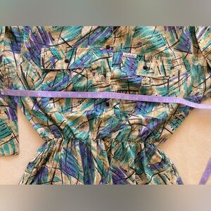 Stylish and vibrant, this teal, purple and tan patterned dress is perfect for any occasion. Fun and funky style, in good used condition. Dress has some structure, shoulder pads are still attached, button front, collared. Has pockets on both sides. Does not have a lot of stretch.