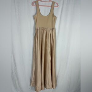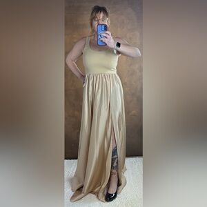 Chic cream maxi dress with a stylish slit. Perfect for versatile wear.