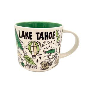 This Starbucks Lake Tahoe Been There Series mug features a vibrant design celebrating the beauty of Lake Tahoe. Its 14 fl oz capacity and green interior make it ideal for hot beverages. Dishwasher and microwave-safe for added convenience.