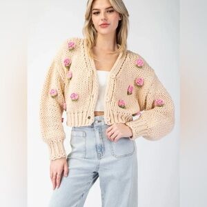 EE:SOME 3-D Floral Rose Knit Cropped Sweater Cardigan