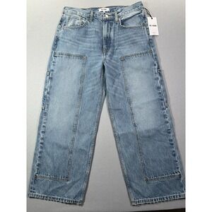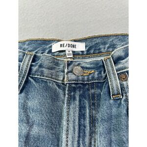 The Re/Done Size 26 Shortie Jean in Hacienda Blue is a stylish and versatile pair of ankle-length jeans made from 100% cotton denim. Featuring a relaxed fit with a high-rise waist, these jeans are accented with a zip and button closure, cargo pockets, and the brand's logo. Perfect for any season, these cropped jeans are a wardrobe staple for women looking for a trendy and comfortable option.