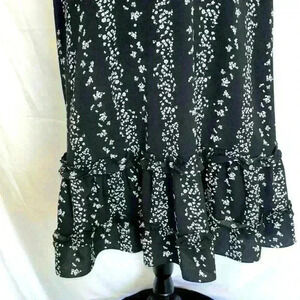 Chic mini dress by BCBG Paris. Features a black base with white floral pattern. Sleeveless design with a ruffled hem. Perfect for casual outings.