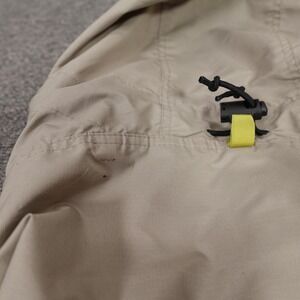 Pre-owned vintage Patagonia Essenshell pullover jacket with moderate general wear from prior use. Nylon shell shows wrinkling from storage along with several visible marks, including small dark smudges on the yellow front near the right pocket zipper, light brown spotting around the lower half-zip placket, and a faint gray mark on the beige sleeve. Back shoulder area near the hood adjustment features a few small red speckled stains on the beige fabric. Fabric, seams, elastic cuffs, zippers, and hem drawcord remain intact and functional with no holes or tears.