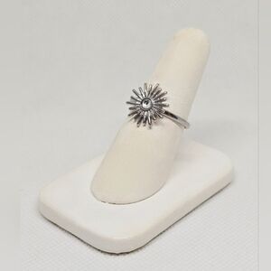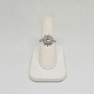 Stylish silver-tone statement ring featuring a radiant sunburst design with a clear simulated center stone. The starburst / daisy-inspired motif adds texture and sparkle, making this an eye-catching piece for everyday wear or stacking.