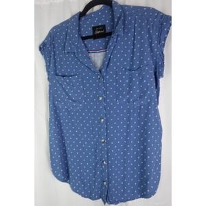 JACHS Girlfriend Blue Shirt L Cottagecore Sleeveless Chambray Floral Blouse