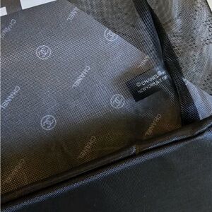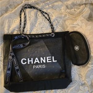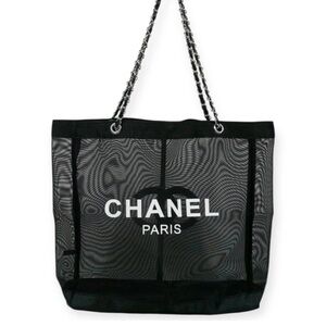 This CHANEL Black Mesh Shopping Shoulder Tote is a Novelty VIP gift bag with silver tone chain and features CHANEL PARIS and CC logos on each side of the tote.