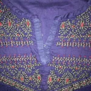 Eggplant colored 3/4 length top embroidered with slate gray and pink/red design. Three hook & eye front clasps over chest. High low style. Crinkle finish. Oversized. Great colors for fall. Boho style.