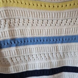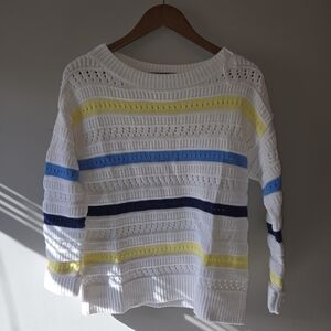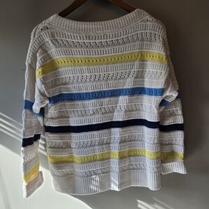 Chic white sweater with bold blue and yellow stripes. Perfect for casual wear or office wear. Very fresh feeling. Would make a great spring sweater. In like new condition. Size medium.