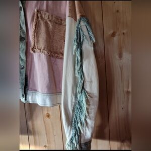 Chic denim jacket with a two-tone design. Features subtle fringe accents. Ideal for casual wear.
