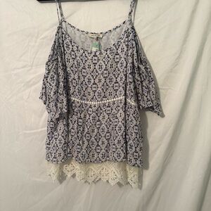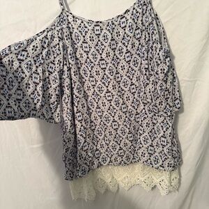Chic blouse with geometric design. Features lace hem and shoulder straps; off the shoulder. Lined.