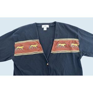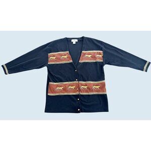 Really great vintage cardigan sweater by Lisa International. Dark blue with design featuring puma or cheetah in gold. Gold buttons. Size medium. Really cool piece in great pre-owned condition!!!
