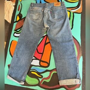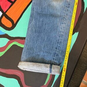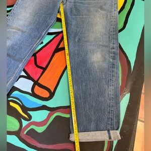 Stylish Levi's straight jeans. Versatile blue color. Ideal for everyday wear. Signs of use including faded color on the bottom area and a mark on the leg. See photos for flaws and measurements. Fit like a women’s 12 in my opinion. Please use the measurements in the photos. Thank you!