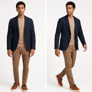 Stylish navy blazer paired with a tan sweater and pants. Perfect for a smart casual look.