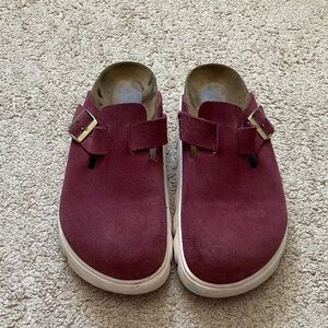 Great condition gently worn light wear shown Birkenstock Papillio 41 Women's Burgundy Suede Buckle Platform Clogs Mules Perfect for any casual outing. Comes from a smoke free home