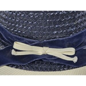 VINTAGE 1940 Or 50s Ranleigh Black Straw Hat Velvet Navy Ribbon Cream Rim U.S.A.