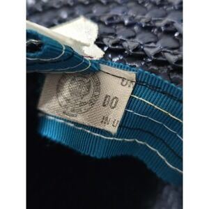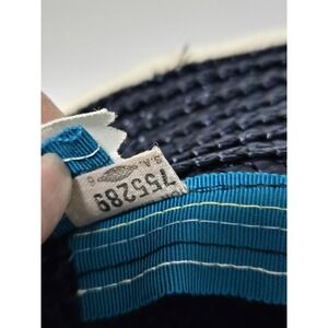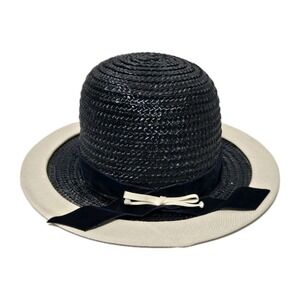 This vintage Ranleigh straw hat is a stunning addition to any collection. The black color and navy ribbon provide a classic, timeless look. The cream rim adds a touch of elegance and sophistication. This hat is one size fits all, making it a versatile accessory for any occasion. Made in the United States, this hat is of high quality and sure to impress. Perfect for any vintage hat enthusiast or lover of timeless fashion.
