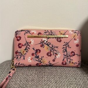 Elegant pink wallet with floral pattern. Features gold accents and zipper closure. Perfect for adding a touch of style.