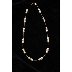 Anne Klein ll vintage 30" station necklace showcases a sophisticated blend of faux pearls and textured gold-tone knot spacers. This elegant long strand features a delicate twisted rope chain with a secure lobster claw clasp and a signature AK logo hangtag. Perfect for layering or wearing as a single statement piece, it offers a timeless aesthetic that transitions effortlessly from professional attire to evening wear.