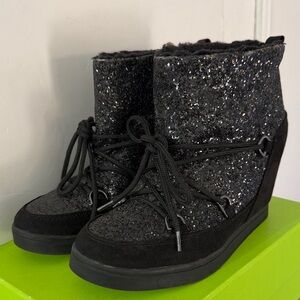 These boots are characterized by their hidden wedge design and shimmering glitter/sequin detail on the upper.