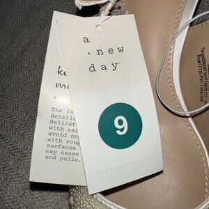 Elevate your look with the A New Day Milan Pearl Slingback Heels in ivory, Size 9, brand new with tags. These elegant satin heels feature pearl embellishments, a pointed closed toe, and a chic 2-inch kitten Louis heel for subtle height. Designed with a cushioned polyurethane insole and a textured TPR outsole, they offer comfort and stability for all-day or evening wear. The slip-on slingback style and medium-width fit make them perfect for weddings, parties, formal events, or polished everyday outfits. Easy to maintain—simply clean with mild detergent for long-lasting beauty.