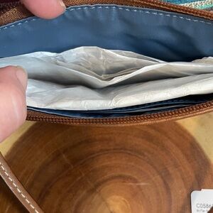 Features: Top zipper closure, leather hangtag, interior lining with pocket, and a detachable leather wristlet strap.
