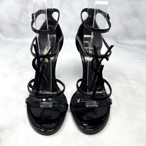 Saint Laurent YSL Cassandra Patent Leather Strappy Sandal Heel Designer Black 37