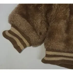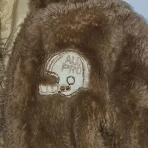 This is a Vintage 1960s Boy's Toddler Coat Jack. It is a brown fleece insulated coat that is full zip with a hood. It has a football helmet patch with All-Pro on the helmet. The shell is acrylic, lining is nylon, and filling is polyester. It is in very good condition without damage or defects.