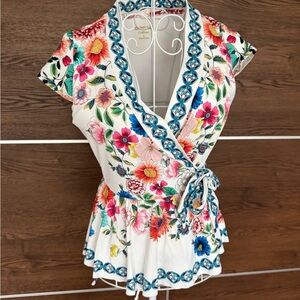 Embrace vibrant style with this Johnny Was floral wrap top. Featuring a beautiful multicolor design on a white base, it's perfect for any occasion.
