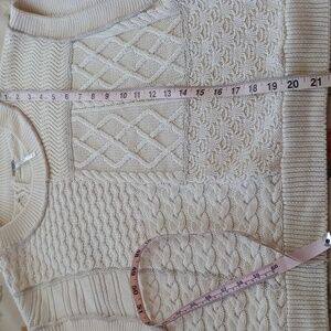 Pieced cable knitted design with a slouching dropped dolman armholes for a relaxed fit