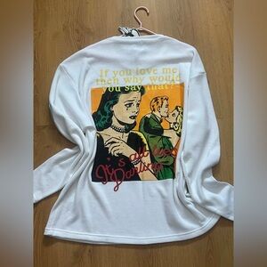 White crew neck sweater featuring artistic graphics. Stylish and modern design.