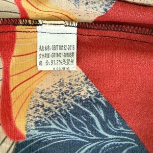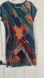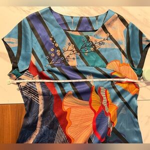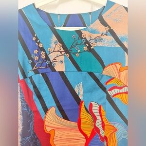 Vibrant dress with floral and geometric patterns. Features shades of blue, red, and orange. 92.1 % silk Measurements: shoulder 15.5 inches; PTP 18 inches, zipper on right side. Length 37 inches. Ideal for US8