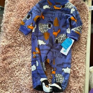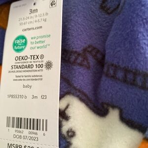 Carter’s sleeper size 3m colors dark blue a little white in it , a little brown in it very cute and warm and cozy for the cold winter months.