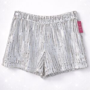 Turn heads in these fully embellished white sequin shorts featuring vertical striping for maximum sparkle and movement. Flattering high-rise fit with a structured waistband and fully lined interior for comfort.