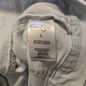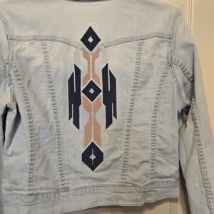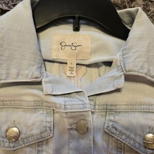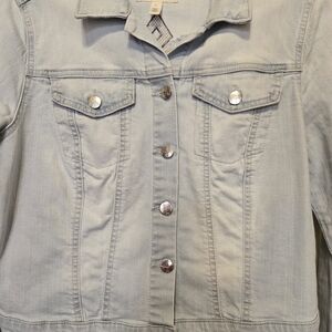Stylish sky blue denim jacket, large. Features button closure and chest pockets. Ideal for casual wear.