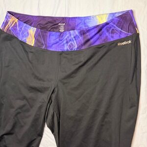 Keywords: Reebok leggings, athletic pants, workout capris, activewear bottoms, plus size leggings, performance wear, athleisure, running pants, gym clothes, fitness apparel, drawstring capris, print waistband, comfortable fit